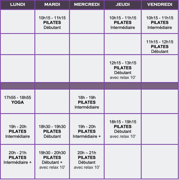 Cours non contractuels susceptibles de modification ou d´annulation. Afin de maintenir la qualité des cours collectifs, le nombre de participants est limité au minimum de 4 personnes et maximum 11 personnes. Possibilité d’inscription toute l’année.