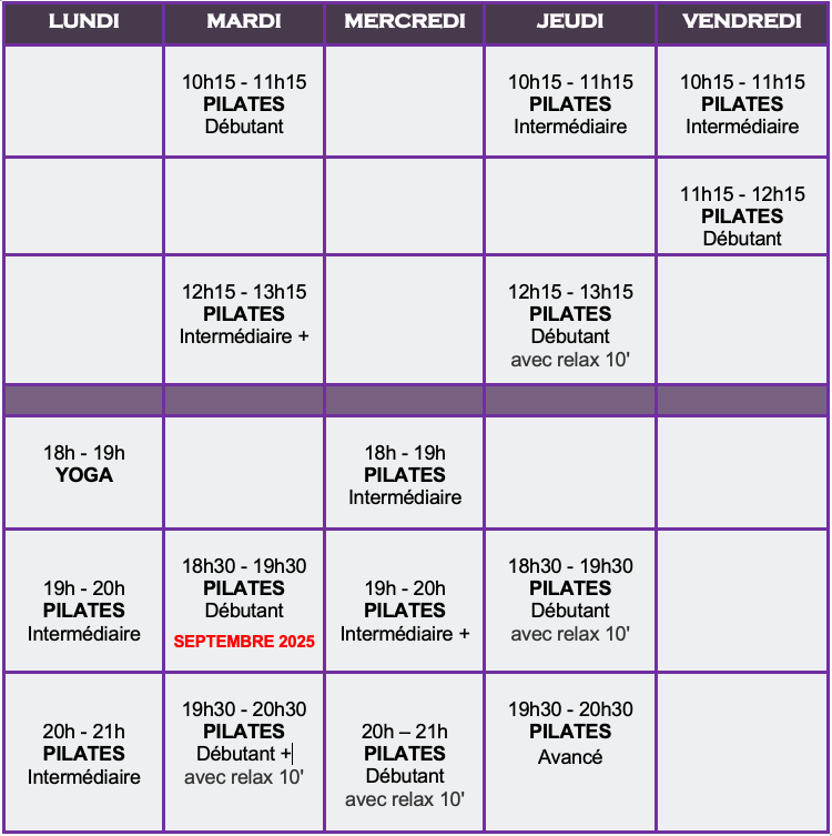 Cours non contractuels susceptibles de modification ou d´annulation. Afin de maintenir la qualité des cours collectifs, le nombre de participants est limité au minimum de 4 personnes et maximum 11 personnes. Possibilité d’inscription toute l’année.